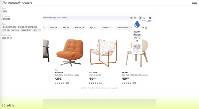 Based on this investigation, they developed a Chrome browser extension that visualizes the digital water footprint generated by everyday online activity. The tool displays, in real time, how much water is consumed through activities such as streaming services, cloud storage, web searches, and social media use. By presenting these figures concretely, the extension makes the hidden material costs of digital infrastructure perceptible and encourages users to recognize the environmental consequences of their digital habits. Rather than functioning merely as a measurement device, the tool transforms digital consumption into a site for political reflection.