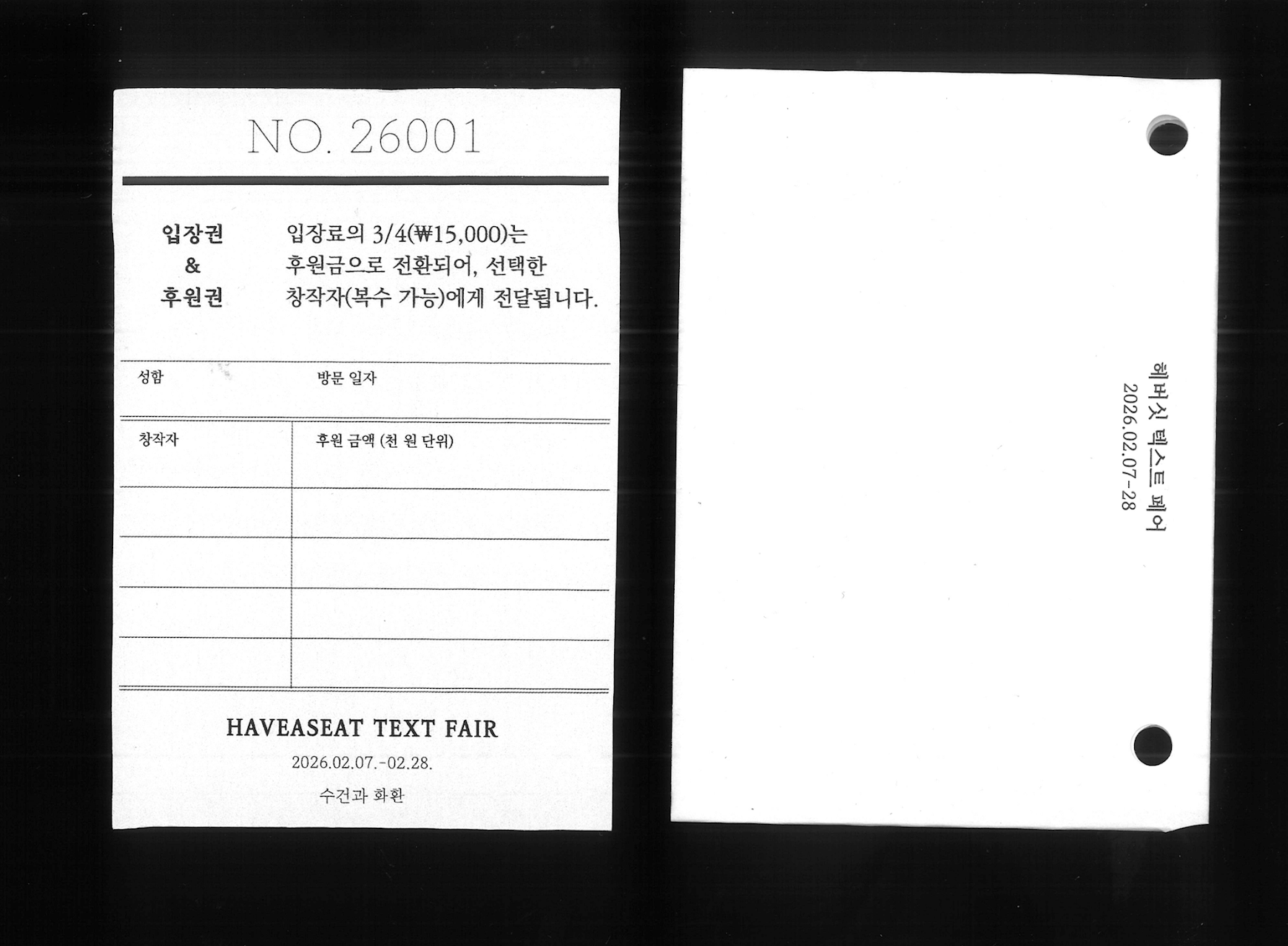 입장료는 현장에서 사용 가능한 후원 토큰으로 전환되어, 관객의 감상 경험이 창작자에 대한 지지로 이어지는 구조를 만듭니다. 감상과 유통, 실험과 경제성이 공존할 수 있는 유연한 예술 유통 방식의 가능성을 〈헤버싯 텍스트 페어〉에서 모색하고자 합니다.